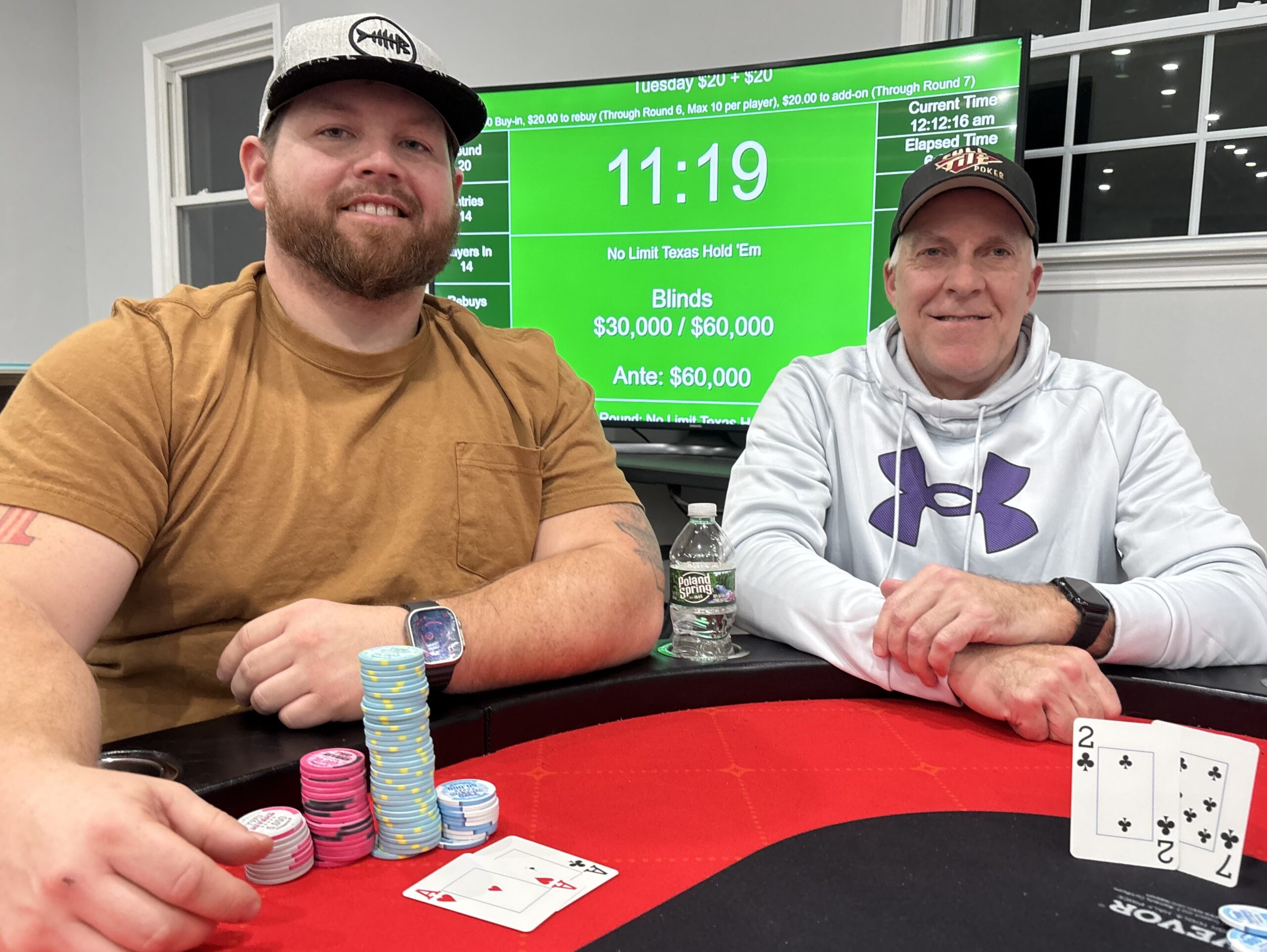 Before heads up play could get started, our two finalists agreed on an even chop. Dan Ka. (Maine, NY) and Brendon Van. (Port Crane, NY) collected $465 each for their impressive performances. Their chop came from two different paths. Brendon had built a large stack early and applied constant pressure to reach heads up play with a pile of chips. Dan had to survive a called all-in on the money bubble and came to the final table as one of the shorter stacks before spinning it up at the best time. Congrats to both!!!