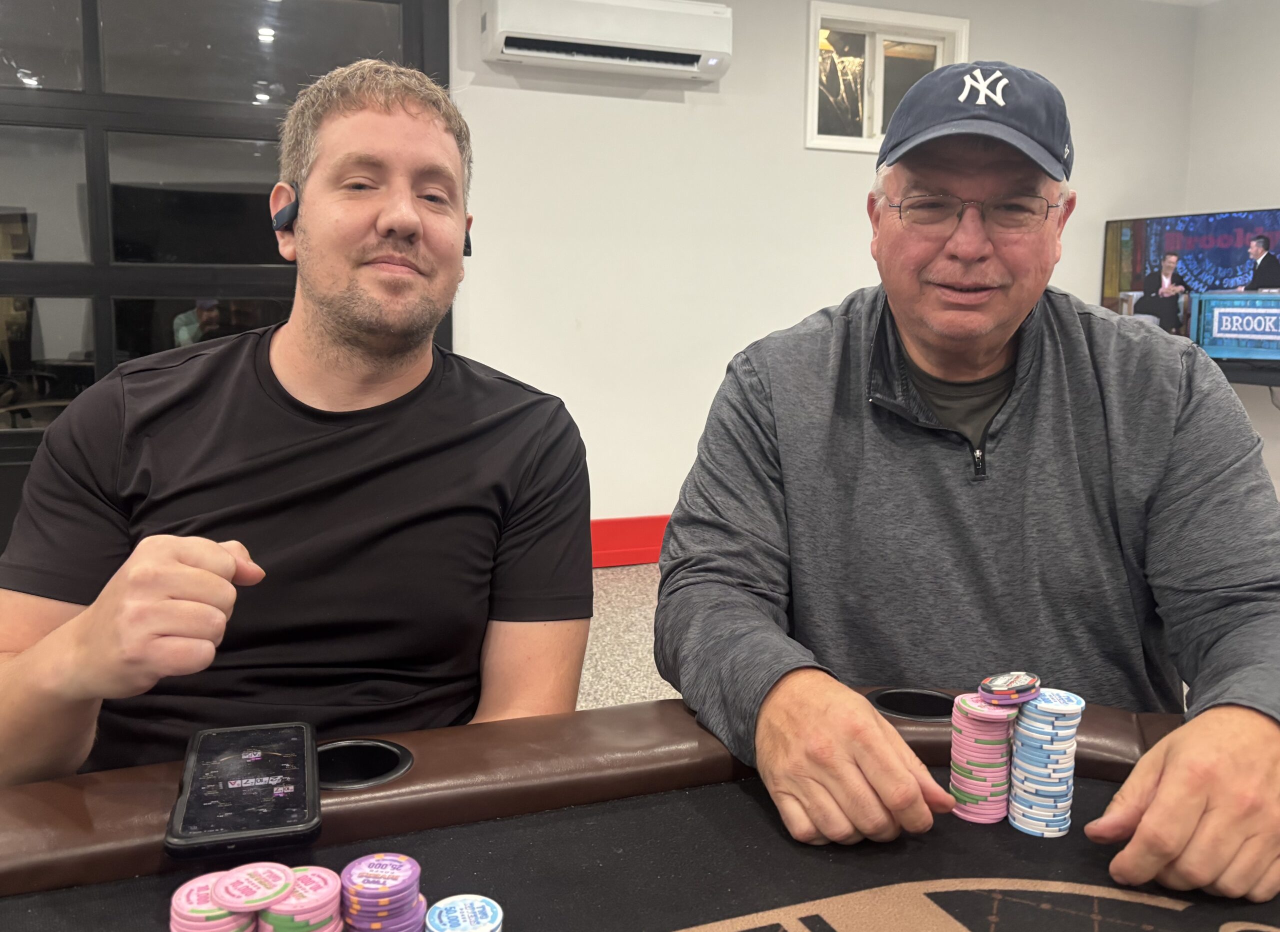 Lucas couldn’t hold the chip lead for long, getting it in with top pair against a flopped set, sending him home in 3rd place with $480. Our two remaining players, 607poker.com regular Mark Gra. (Binghamton, NY) and first time player Scott Fer. (Port Crane, NY) agreed on an even chop at this time, taking home $845 each for a night of hard work.