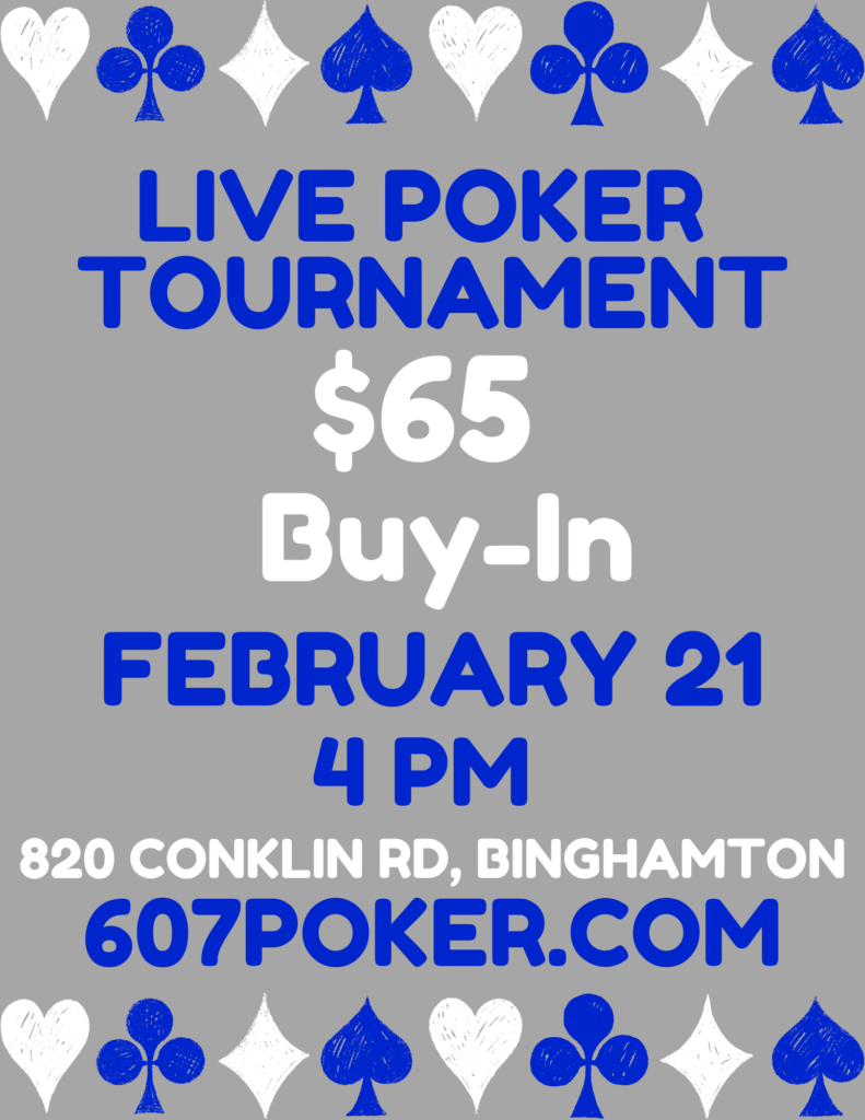 Our final No Limit Texas Hold Em Tournament of the Winter 2025 Regular Season will be March 15th at 5 PM. This is a $90 buy-in tournament for 35,000 chips…