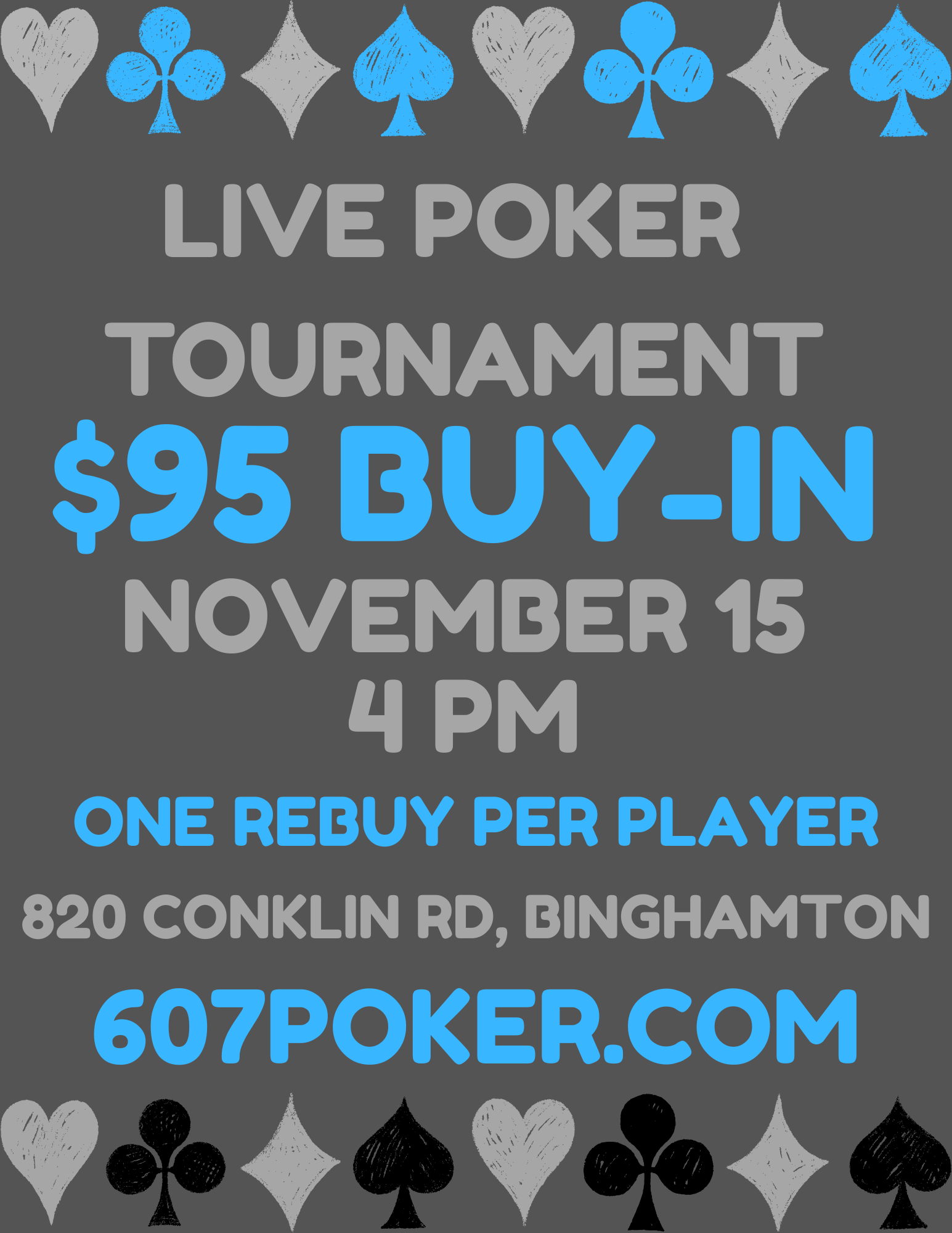 Event #8 in our Fall 2025 League is a $95 buy-in No Limit Texas Hold Em Tournament. Players receive 40,000 tournament chips for their $95 buy-in and blinds start at 100/200. Blinds increase every 20 minutes and players have the option to rebuy a maximum of one time during the first six levels of play.