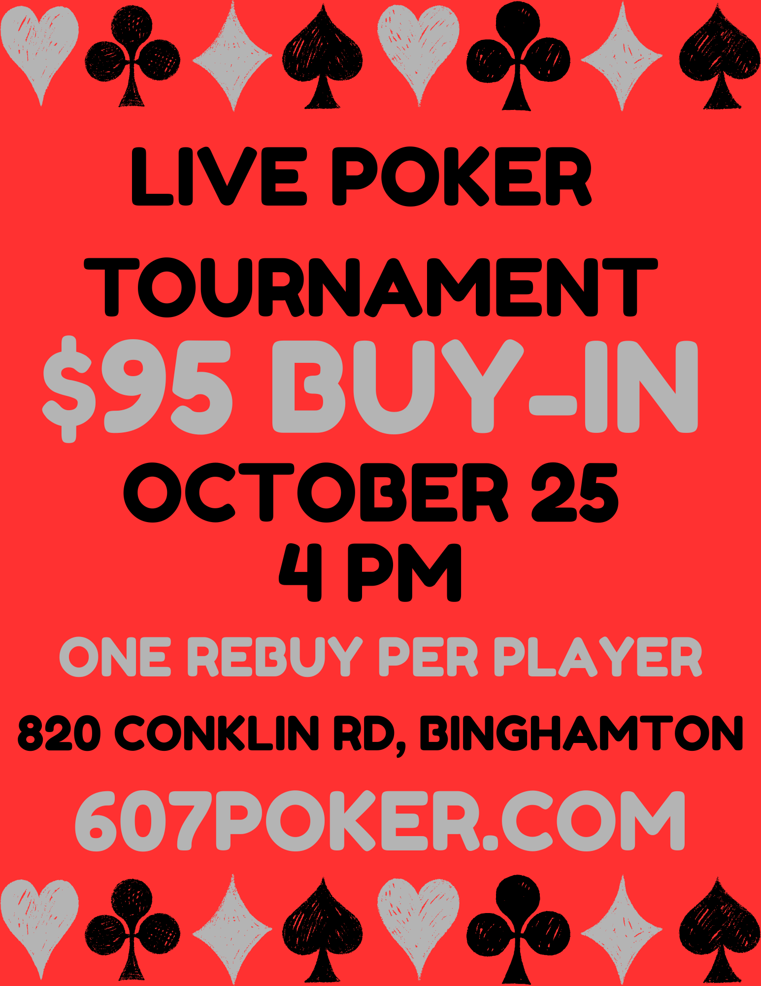Event #4 in our Fall 2025 League is a $95 buy-in No Limit Texas Hold Em Tournament. Players receive 40,000 tournament chips for their $95 buy-in and blinds start at 100/200. Blinds increase every 20 minutes and players have the option to rebuy a maximum of one time during the first six levels of play.