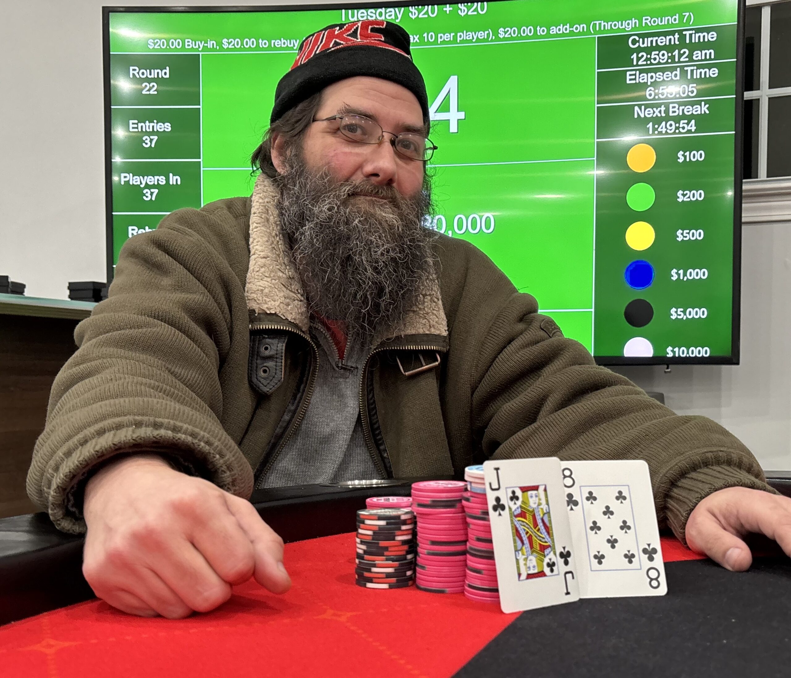 On the bubble, 12 players fought to ensure they were not the last one heading home without a stop at the payout desk. Unfortunately for 607poker.com first timer Aidran Tor. (Middleton, NY), he couldn’t avoid the dreaded bubble boy designation, exiting without a payday. Play resumed with Jackson Hoy. (Owego, NY) making his return after a prolonged absence to capture 11th place and a $60 payout. Max Alp. (Binghamton, NY) showed out in his debut at 607poker.com, finishing in 10th place and collecting $70.